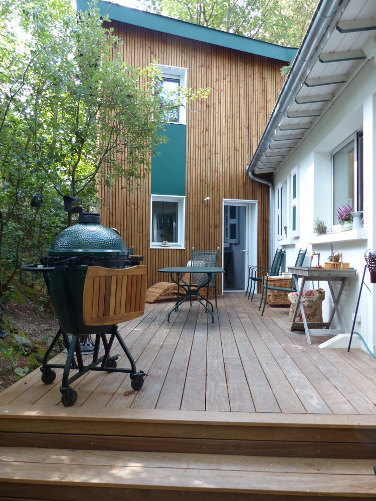 MAISON sous les arbres, a su garder son charme d'origine, les propriétaires ont choisit une extension en bois qui s'intègre complètement a son environnement naturel.